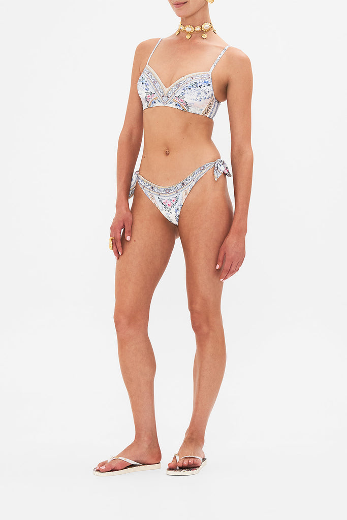 The Season Of The Siren Dip Front Pant with Ties wanders into an ethereal world of oceanic blues framed by intricate mosaic archways laced in delicate florals. Indulge in sustainable style with these bikini bottoms, crafted from ECONYL® regenerated nylon. The bikini bottoms feature a high-cut design, which elongates the legs to create a sleek silhouette. Signature CAMILLA crystals add a touch of glamour and sparkle, catching the light at every angle. Subtle gold hardware accents enhance the chic aesthetic, while the cheeky coverage of these bikini bottoms strike the perfect balance between allure and werability. Whether lounging by the pool or bathing in the sunlight beachside, these sustainable bikini bottoms are destined to become a beloved resort wear treasure.