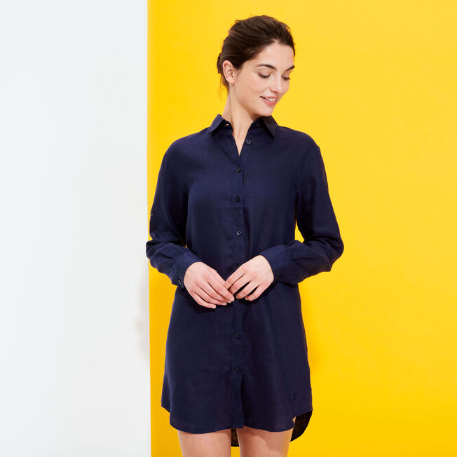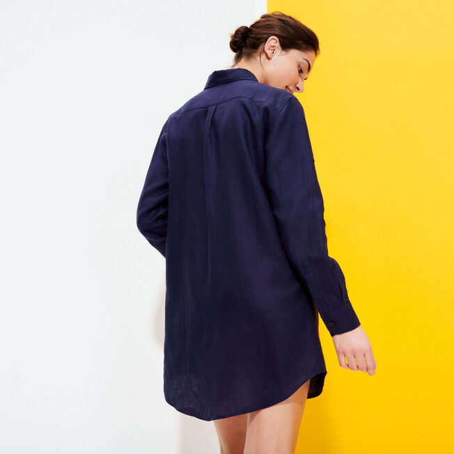 Smart and timeless, the Fragrance plain women's dress is made from supple linen that never goes out of fashion. Its long cut means it can convert into a tunic or long-sleeved dress, to wear with trousers or over a swimsuit. A Vilebrequin turtle is embroidered in a tone-on-tone colour on the front.