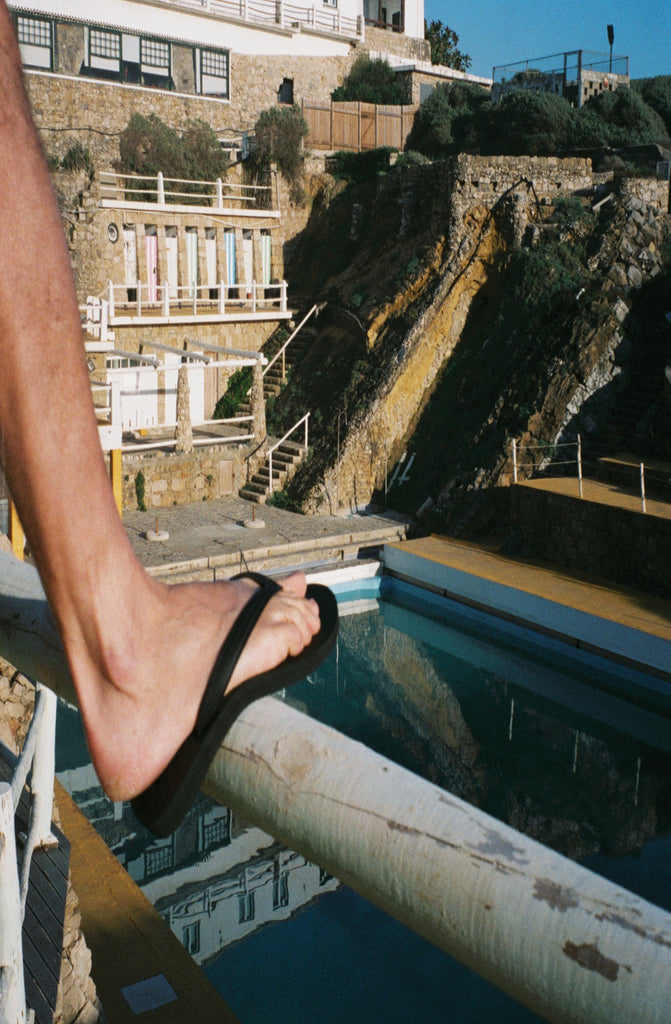 Flat sole in premium grade natural rubber that adapts to the unique shape of your foot. Wide masculine natural rubber strap.