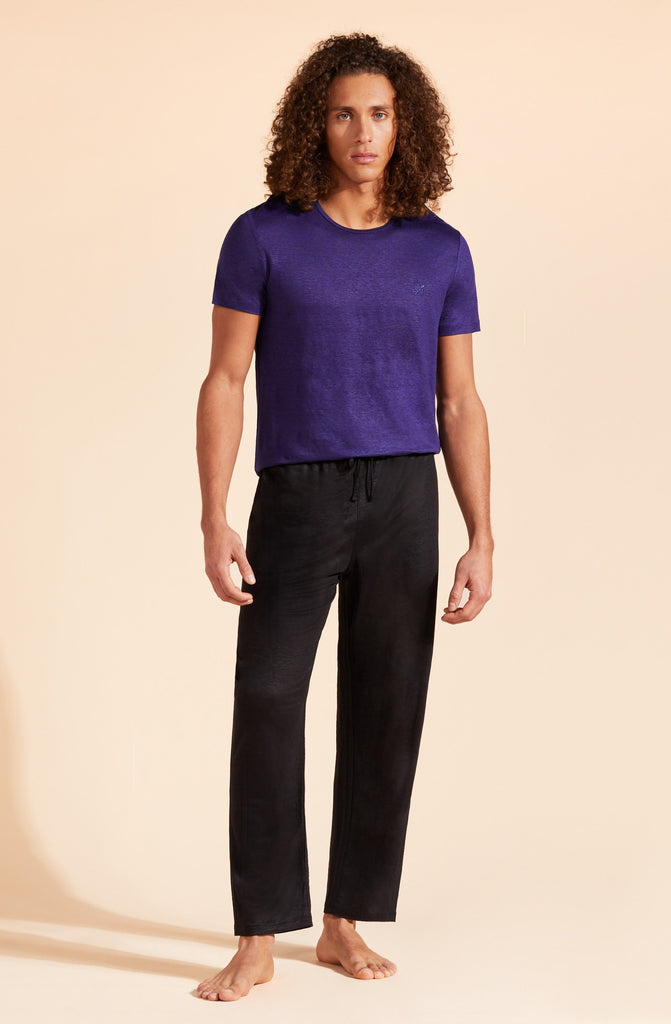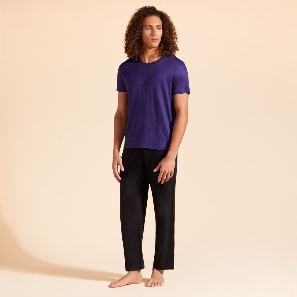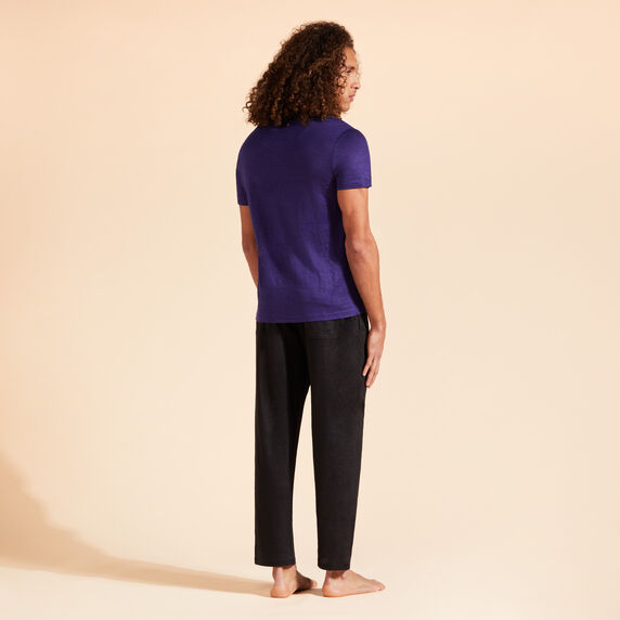 The perfect drape of the linen jersey fabric means that the Tiramisu plain T-shirt looks just as good as Bermuda shorts or underneath a jacket. It is ideal for extremely hot days as it is virtually weightless against the skin. With short sleeves and a round neck, it goes with any kind of style: from smart to casual. A Vilebrequin turtle is embroidered in a tone-on-tone color on the chest.