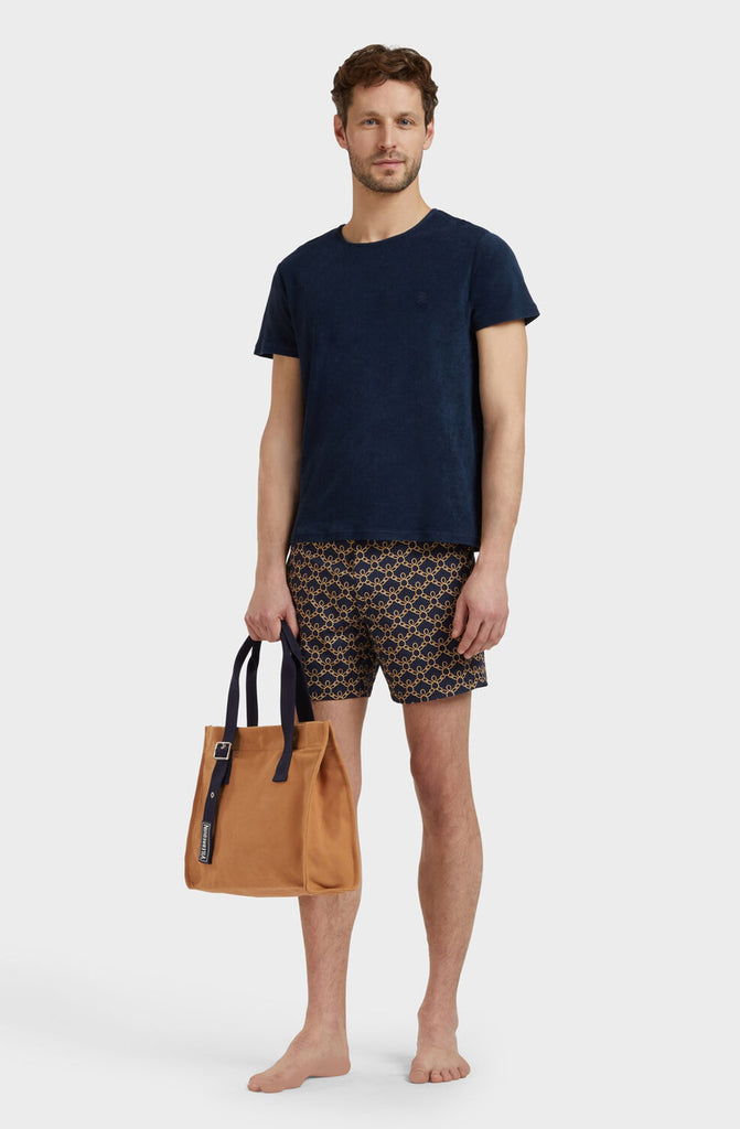 - Short swim trunks with a flat waistband, featuring a custom Vilebrequin snap button and a tone-on-tone zip fly