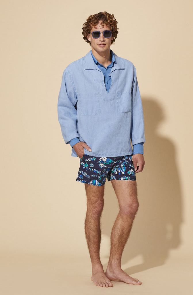 Hermit crabs and curious crabs jostle each other in a nautical print on these Moorise Hermit Crabs men's swim trunks. They are timeless stretch shorts celebrating all that is crustacean in flat blue planes.
