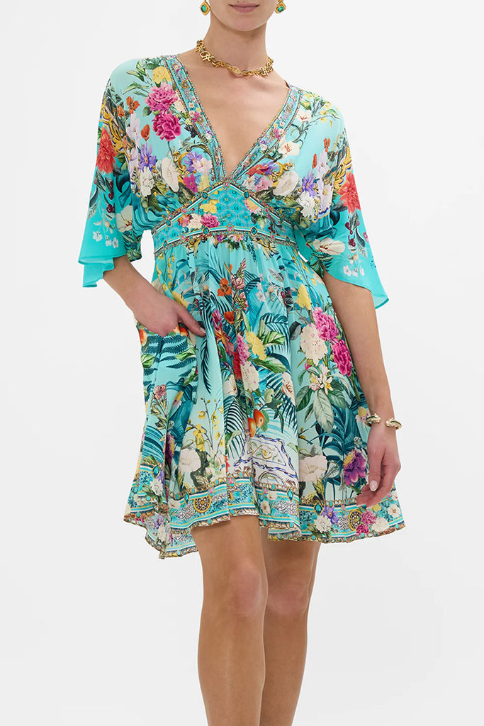 Designed in Australia, The Gardens Of Queluz Short Waisted Dress invites you into Queluz Palace, where vivid greens and lush florals blend with the elegance of Azulejo tiles, celebrating nature and artful design. Lovingly handcrafted, this elegant silk mini dress features a soft voluminous bodice that cinches into an adjustable shaped waistband detail. The skirt softly gathers and drapes into a flare at mid thigh and the batwing style ruffle sleeves create decadent drape at elbow length.