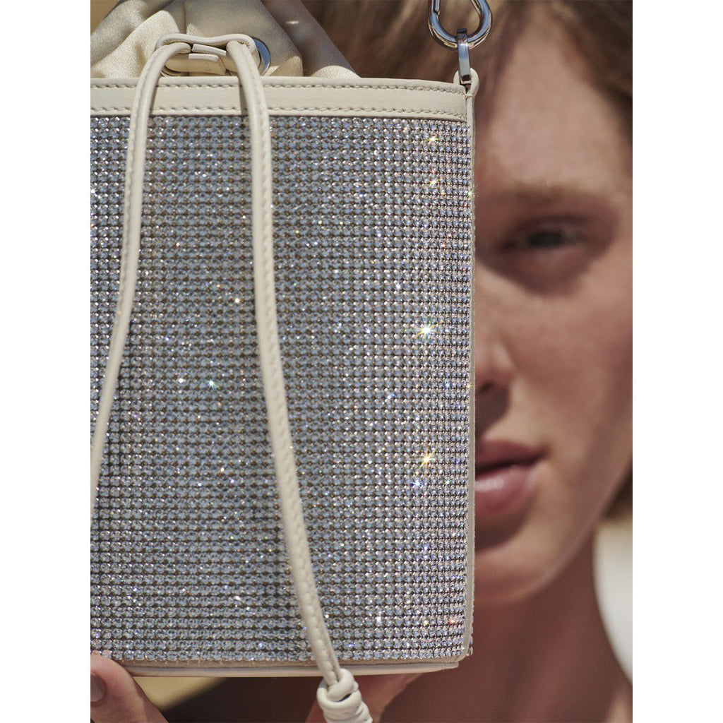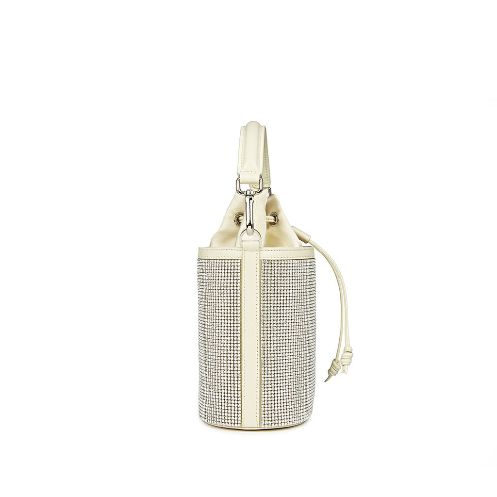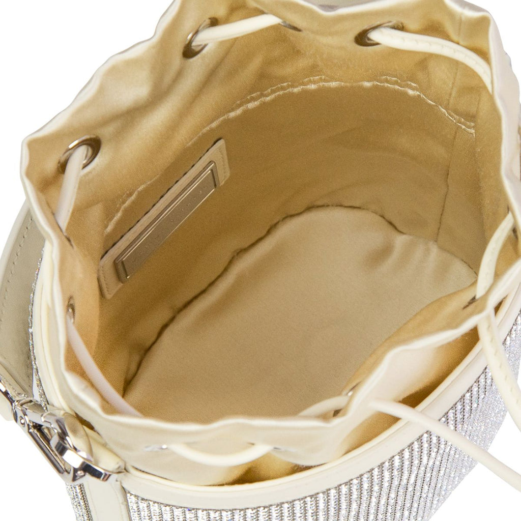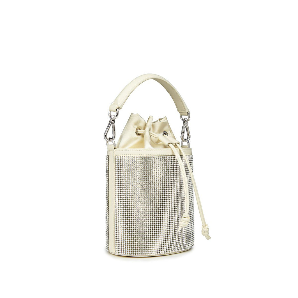 The Micro Carina is the perfectly scaled down version of our classic bucket bag; big enough to fit your bare essentials. This radiant party-bag is composed of thousands of Swarovski crystals that cover almost its entire body. Luscious cream leather frames the bag by upholding the trims and handle. The top of the bag is secured using soft cream silk and is safely fastened with a cinch made of the same Napa leather. The interior is lined with soft cream silk and is modified expertly to create a single phone pocket. Inside each bag rests a small adjustable leather strap of the same Napa coloring, allowing you to style it as a cross body as well.