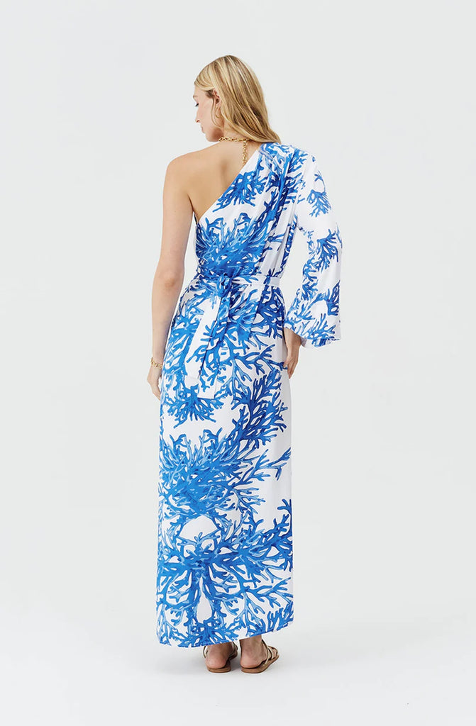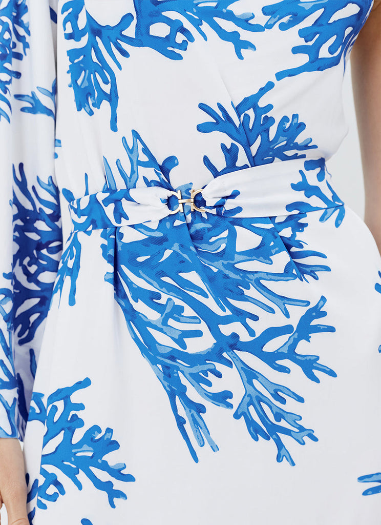 A hero style from this collection, the Lauren Dress skims the figure before falling to the floor, with a chic fabric belt decorated with golden hardware detailing at the waist. The asymmetric dress is made from a light-weight, buttery soft fabric emblazoned all over in a ‘Blue Coral’ print. Choose the Lauren for a nod to beachy style while occasion dressing.