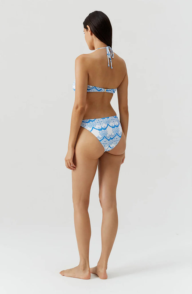 Adorned with our delicate Florian motif for a touch of effortless elegance. Crafted from premium swim fabric with SPF 50 protection, this set blends refined style with practical luxury. The chic bandeau top features graceful halterneck straps and a secure clasp fastening at the back, punctuated by a luxe gold trim at the center of the bust.