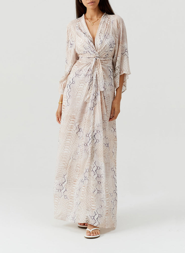 Channel effortless elegance with the Wisdom Lizard Kaftan. A statement piece for your destination wardrobe, it’s designed in a flowing maxi silhouette, its wrap style cinches delicately at the waist. The wide, relaxed sleeves drape just below the elbow for a touch of bohemian sophistication. Crafted in a subtle, neutral-toned animal print, Wisdom is the ultimate in versatile glamour.