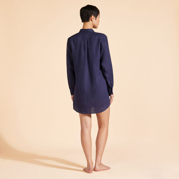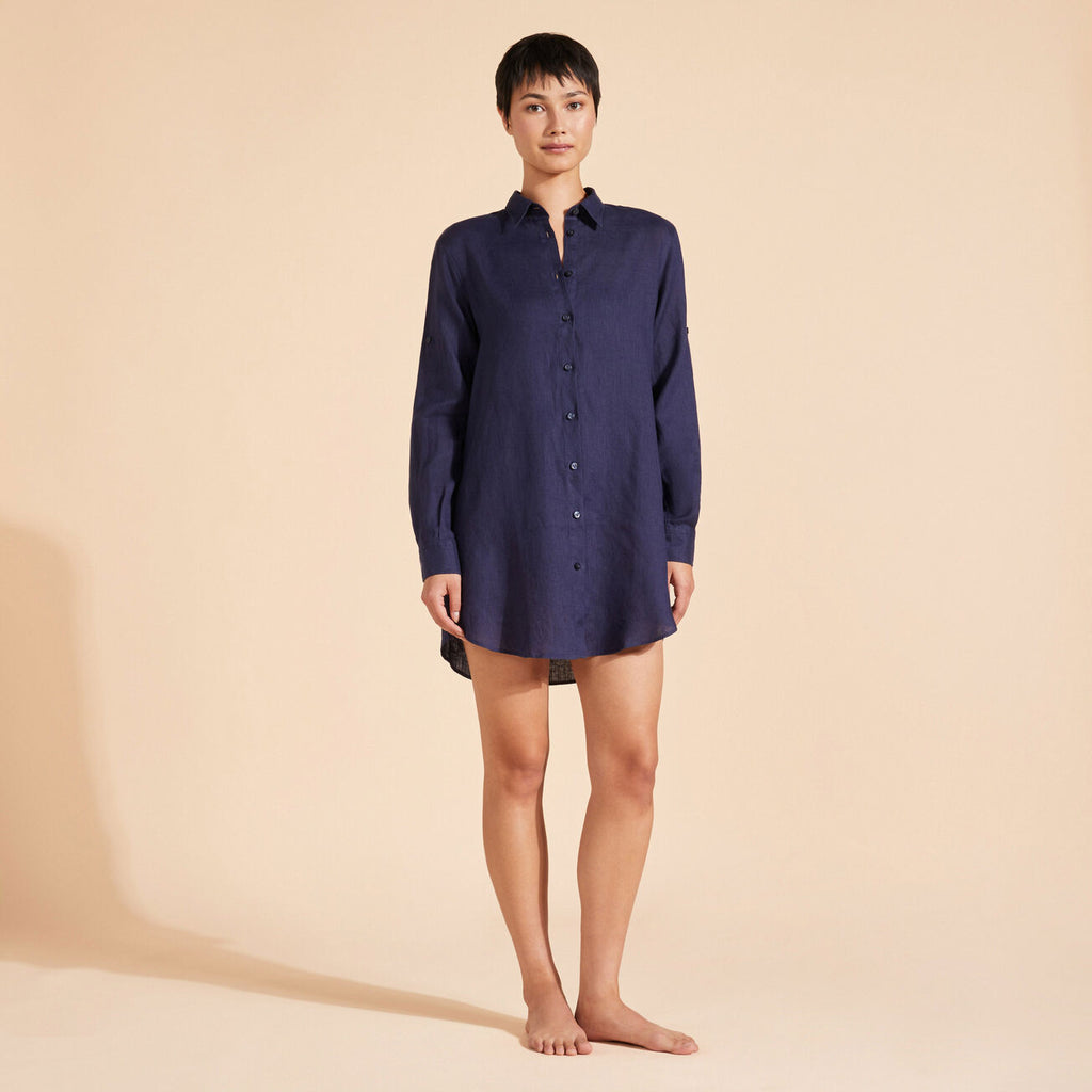 Slip on the Fragance women's shirt-dress over your swimsuit after your daily swim. The light and floaty linen fabric is particularly comfortable, making it perfect for laid-back holidays. Its loose cut and long sleeves make this plain shirt the ultimate in casual chic.