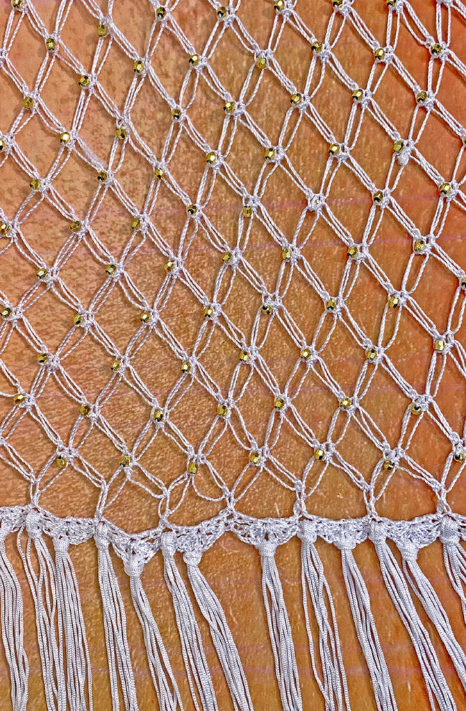 An elegant hand-crafted white fringe sarong, with gold metallic sparkling beads all over it! This one-size crochet sarong is very stretchy and would fit most sizes.