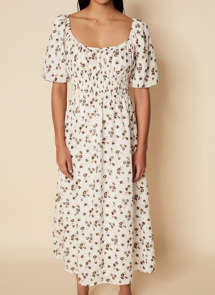 In a vintage inspired, floral motif in tonal chocolate hues, hand printed onto our luxe linen fabrication. This style features a scoop neckline and gathered bodice, elasticated puff sleeves, Ruched waistband and softly gathered, midi length skirt for an easy wearing fit. Designed to take you from day to night, we love this style with heeled sandals for a feminine look. Garment is fully lined.
