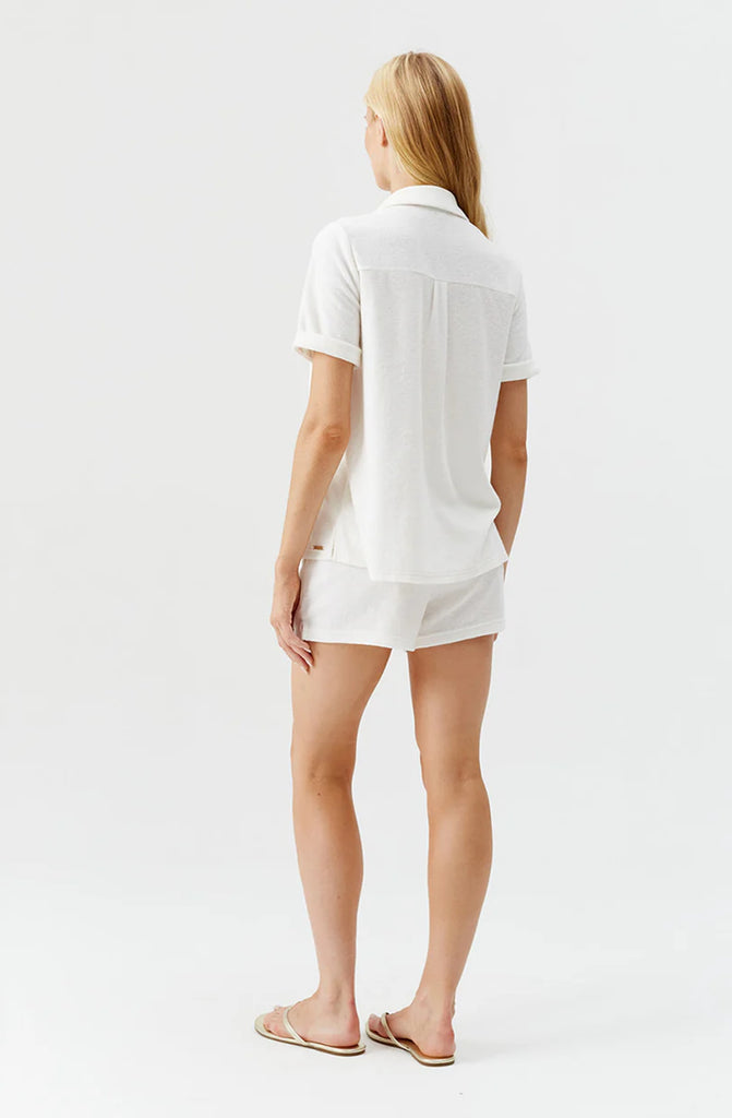 A staple piece for lazy days on the beach, add to your holiday wardrobe with the Tori Shirt. Crafted from premium soft terry fabric, this White shirt features short sleeves with turned-up cuffs. You’ll find two patch pockets on the chest with luxe gold accents on the buttons and a branded plaque.