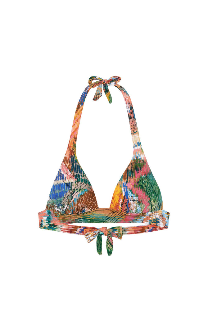 The bikini top DONIA is adorned with refined details to enhance all silhouettes. The pleated seams and the removable molded cups ensure an elegant neckline for smaller breasts. More generous breasts are perfectly supported thanks to the deep triangle cups. This is a both comfortable and feminine model. MASAI, a vivid and multicolored tribal print.
