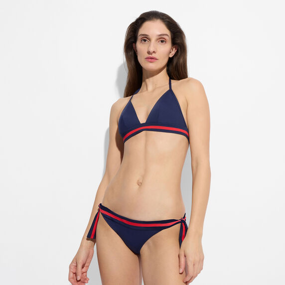 A flattering women’s bikini bottom featuring a side-tie, a navy blue and red striped belt crafted from recycled polyamide and elastane - minimal coverage with maximum style.