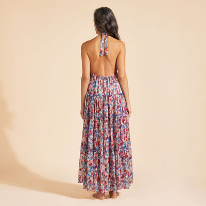 Make an entrance in this low-back halter-tie dress in an elegant floral design. Crafted from viscose and silk for a gentle flow as you walk.